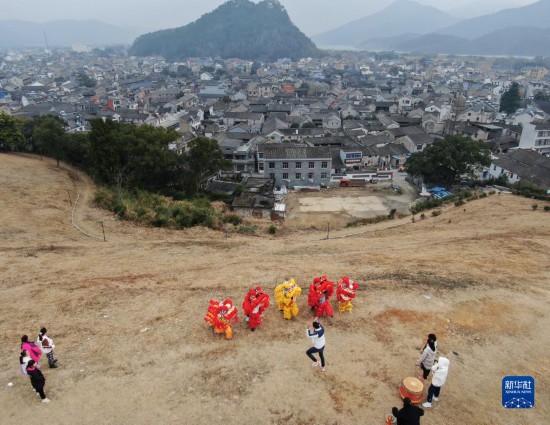 1月20日,在前童古镇边的小山上,童攀峰带领舞狮队进行训练(无人机照片)。