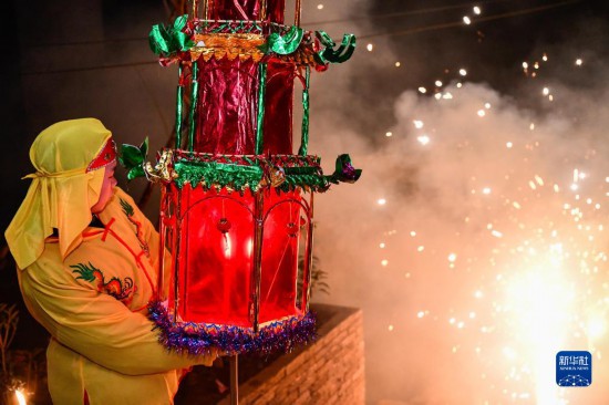 2月7日夜,龙里县龙山镇的村民扛着花灯参加“亮灯巡寨”活动。