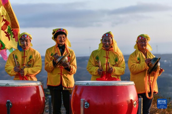 2月7日,戏班成员在排练龙里太平花灯戏时伴奏。