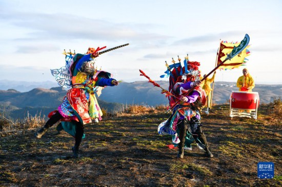 2月7日,龙里县龙山镇的年轻人在村子附近的山顶练习龙里太平花灯戏。