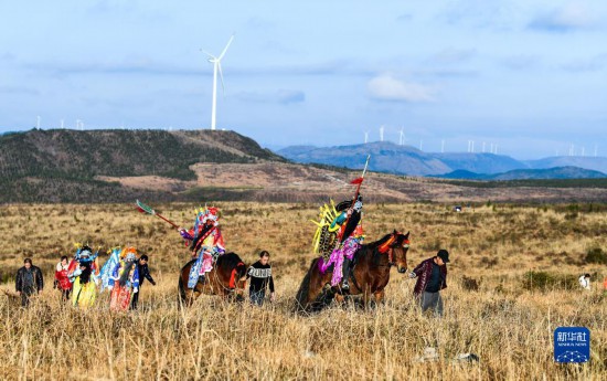2月7日,龙里太平花灯戏的成员前往村子附近的山顶练习花灯戏。