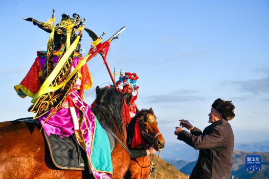2月7日,龙里太平花灯戏艺人朱永兴(右一)在指导村里的年轻人排练花灯戏。