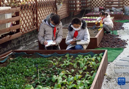 1月21日,在上海市闵行区莘庄镇康城社区的楼顶花园,上海师范大学康城实验学校的学生们在观察、记录自己种植的蔬菜长势。新华社记者 刘颖 摄