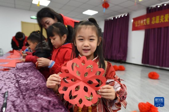 1月26日,在安徽省合肥市高新区长宁中心双河社区新时代文明实践站,小朋友展示剪纸作品。新华社记者 周牧 摄