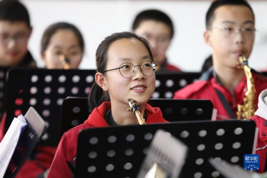 1月18日,在甘肃省白银市会宁县会师中学排练厅,交响管乐团学生在排练时听老师指挥。新华社记者 马希平 摄