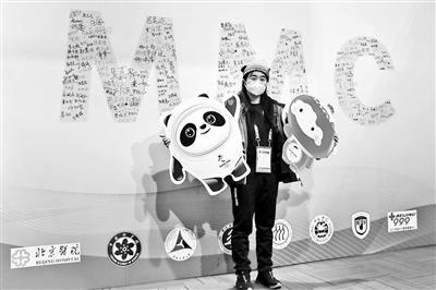 徐雅纯在北京冬奥会主媒体中心与吉祥物合影