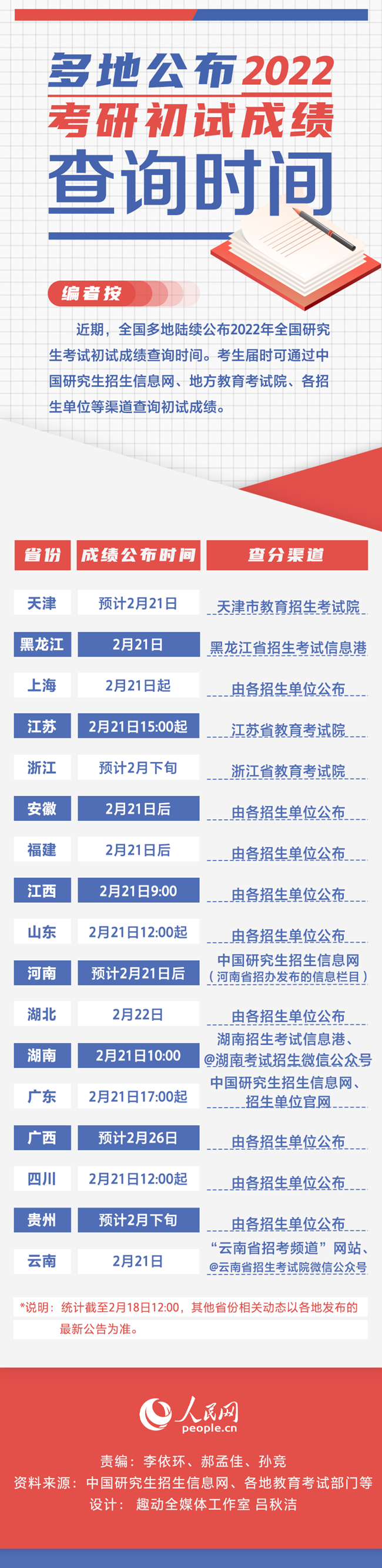 好博体育北京2月18日电 (记者李依环、郝孟佳、孙竞)近期,全国多地陆续公布2022年全国研究生考试初试成绩查询时间。考生届时可通过中国研究生招生信息网、地方教育考试院、各招生单位等渠道查询初试成绩。