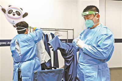 国家体育馆洗衣房,隐藏在场馆的一处角落。美国队训练结束后,工作人员推来一车衣物,牛凯晨和同事“全副武装”,套上隔离衣、戴上面屏和手套,开始清点交接。“刚开始接触各国运动员的衣物,除了汗味扑鼻,由于疫情原因多少还有些紧张,但经历过冬奥会已经习以为常。”牛凯晨说。