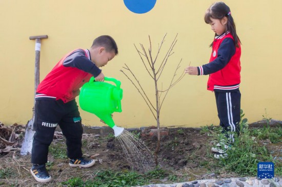 3月11日,在江苏省海安市南莫镇中心幼儿园内,小朋友为栽种的树苗浇水。