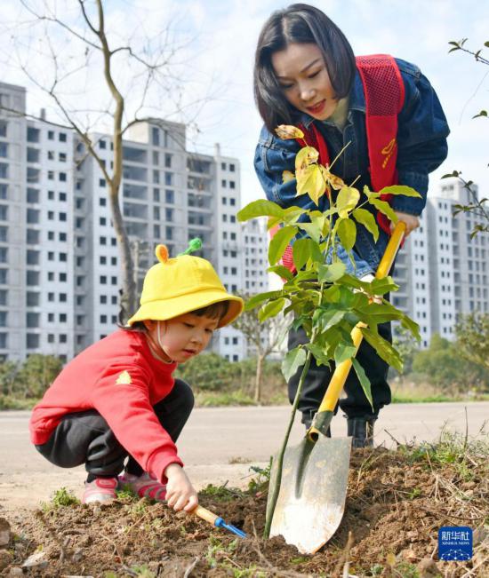 3月10日,在浙江省台州市仙居县官路镇后里吴村,小朋友与家长一起参加植树活动。