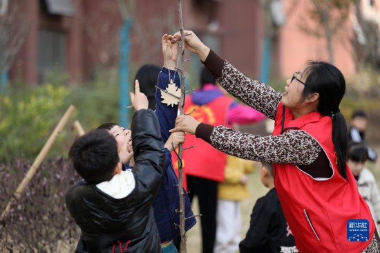 3月11日,在山东省临沂市郯城县郯城街道古城社区,志愿者与孩子们在刚栽植的绿化苗木上挂心愿卡。