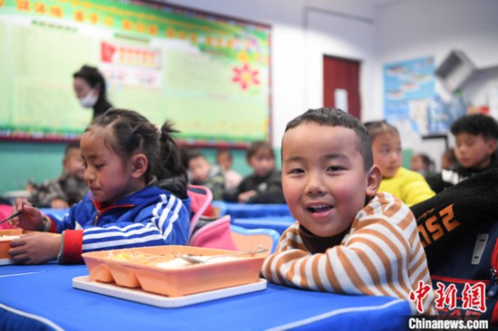 图为3月11日,西藏自治区拉萨市城关区第三小学的学生食用营养午餐。 中新社记者 贡嘎来松 摄