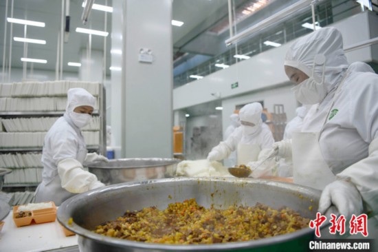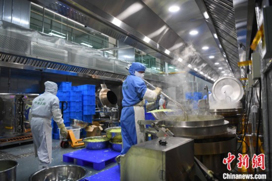 图为3月11日,西藏自治区拉萨市城关区净土拉萨中央厨房配餐车间内,工作人员正在为学生集中配餐。 中新社记者 贡嘎来松 摄
