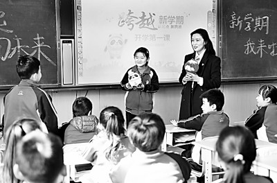 2月16日,山东青岛中德生态园小学,老师和学生在开学第一课上交流冬奥的故事。新华社发