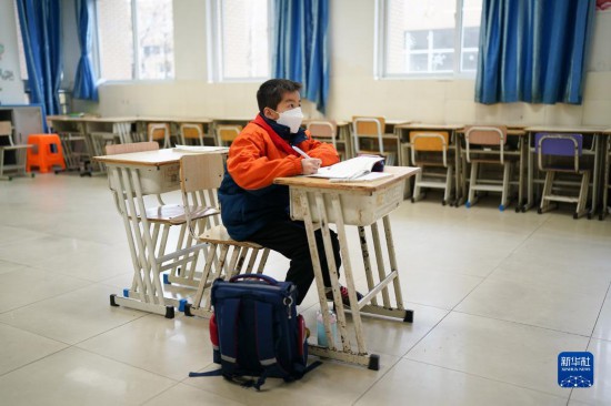 3月21日,蒲芸帆在教室内跟着“空中课堂”学习。新华社记者 丁汀 摄