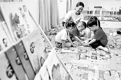 福建省晋江市第十实验小学教师子女托管室,老师为幼儿园放学后的孩子们讲绘本。新华社发