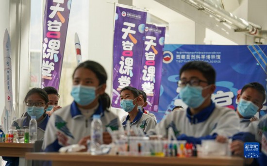 3月23日,在位于拉萨市的西藏自然科学博物馆,学生代表收看航天员授课。