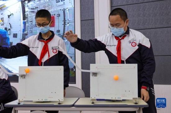 3月23日,在新疆乌鲁木齐市第七十中学,学生收看“天宫课堂”第二课的同时进行抛物实验。