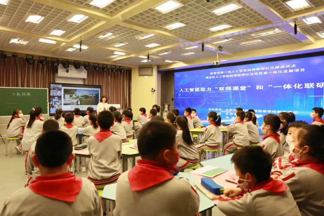 海淀进修学校副校长林秀艳说:“用这种平台,孩子们其实就是上的同步课堂,1+1直播协作的同步课堂,最终通过一个优质资源的重新配置,提升课堂效率,最终达到教育优质均衡发展的目的。一节好的双师课的出现,需要众筹智慧,把一节课打磨到专业化的程度,所以我们把一体化联研作为重要的专业支撑。”