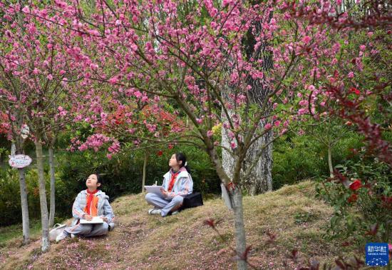 3月31日,岚皋县城关第二小学的学生在巴山珍稀植物园写生。