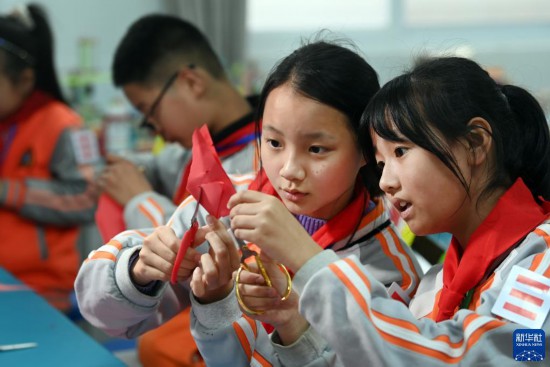 3月31日,岚皋县城关第二小学的学生在校园活动室进行剪纸创作。