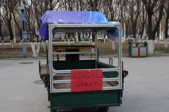 前期,餐食配送全部靠人力运送,工作量大、效率不高。学院的党员教师们首先行动起来,他们连夜开始研究配送工具,用车间物料转运车改装的运餐车1.0版本于第二天一早准时上岗。随后,老师们又盯上了校园内闲置的电动三轮车,通过加装货架、挂钩等,两辆运载量更大且机动性更强的2.0版运餐车投入使用。在寒潮预警、雨雪天气到来前,老师们又通过加装防雨顶棚等完成了对运餐车的升级。这两辆在师生朋友圈频繁被晒的运餐车单车次运餐可达300份,2000余人的送餐任务在30分钟内即可完成。
