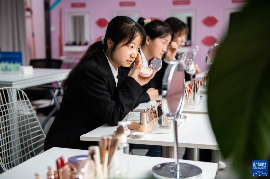 4月14日,在湖南长沙中南大学就业指导中心,学生在面试前化妆。