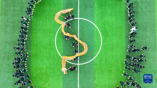 4月18日,湖南省常宁市源江学校学生在操场上练习舞龙(无人机照片)。