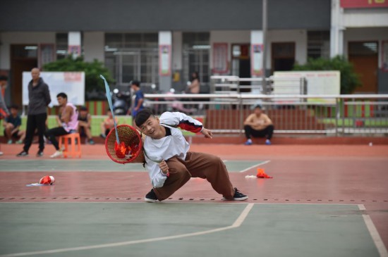 2021年11月4日,在广西崇左大新县民族高级中学,一名学生用背篓接绣球,通过传统民族体育运动强身健体。新华社记者刘岭逸摄