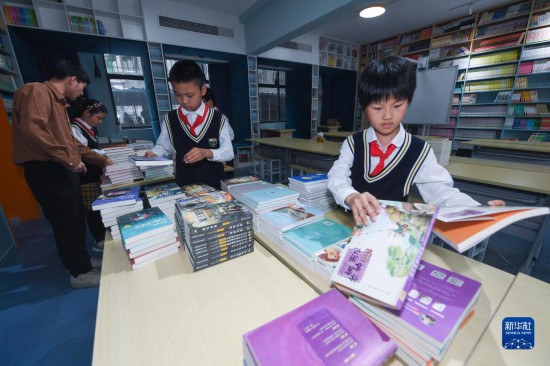 5月11日,湖州吴兴区飞英街道月河小学四年级学生在校图书室学习分类整理图书。