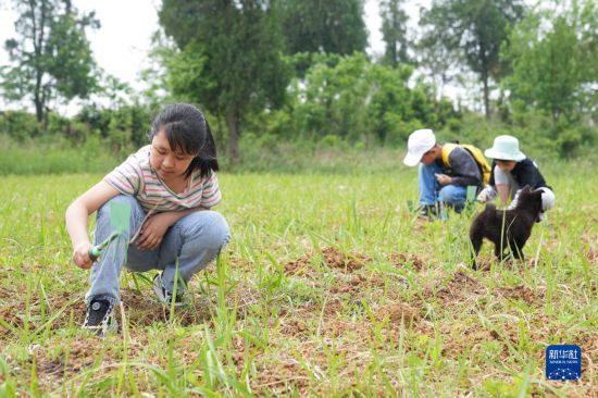 5月15日,在合肥市蜀山区南岗镇“依依田园”,孩子们为花生田除草。