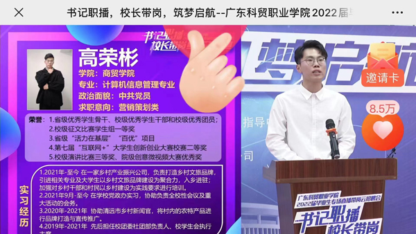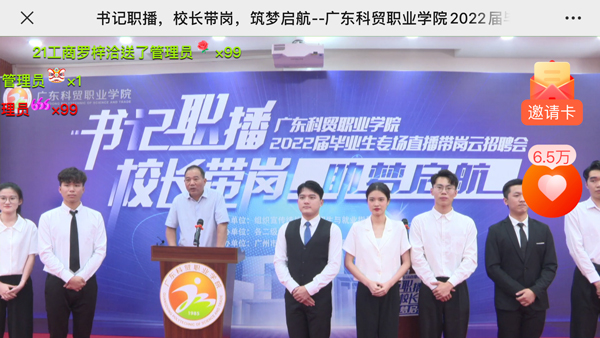 5月14日,在某平台直播间中,广东科贸职业学院党委书记杜方敏为学生“代言”,当起了毕业生“推介员”。校长王海林也化身“网红”进行“直播带岗”,通过招聘直播向企业和公众开展2022届毕业生线上推介。此次线上推介也掀开了广东科贸职业学院针对2022届毕业生开展直播推介的序幕。