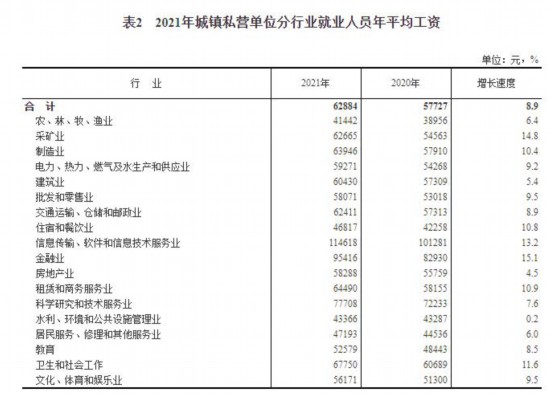 城镇私营单位就业人员年平均工资为62884元,比上年增长8.9%,增速提高1.2个百分点,扣除价格因素实际增长7.8%。