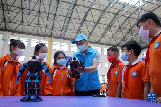 5月26日,科普志愿者为颍上县第十六小学学生讲解机器人编程知识。