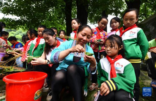 6月2日,在广西融水苗族自治县杆洞乡党鸠村,青年团员和小学生向村里的妇女学习包粽子。