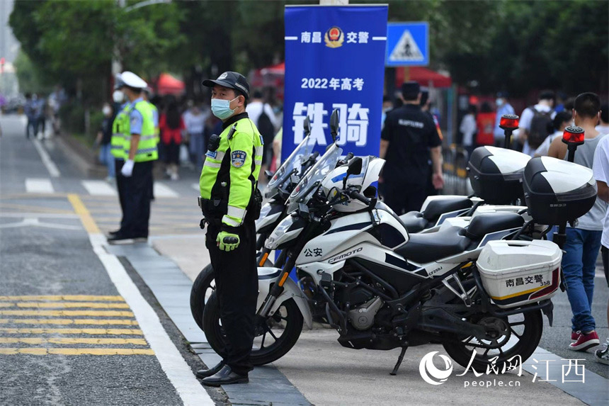 江西某考点前,交警“铁骑”在考点周边维持交通秩序。好博体育 时雨摄