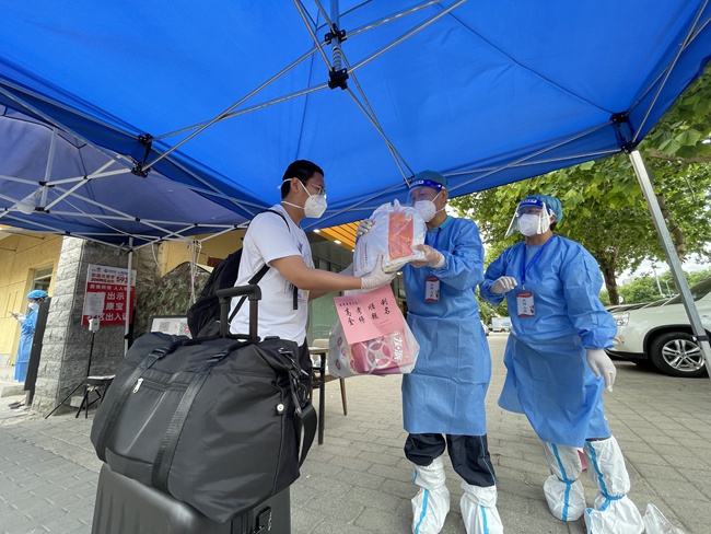 处于封(管)控区的考生,高考期间将“吃住行考”一体化。服务保障跟得上吗?6月6日,在昌平区龙跃苑三区西北门外,送考专车出发前,每位考生都收到了龙泽园街道精心准备的爱心礼包。“高考顺利 金榜题名”爱心礼包上贴有祝福语,红牛、饼干、巧克力、薯片、芒果干、卤味……各种零食把大礼包撑的满满当当,也寄托了社区对高考生的祝福。