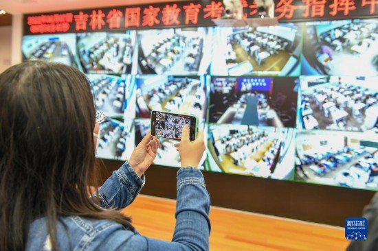 6月7日,在吉林省国家教育考试考务指挥中心,家长代表用手机拍摄监控画面。