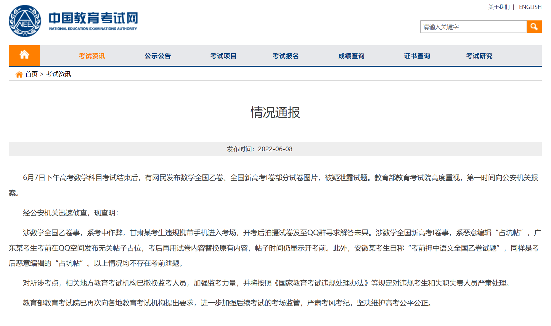 通报中称,教育部教育考试院高度重视,第一时间向公安机关报案。
