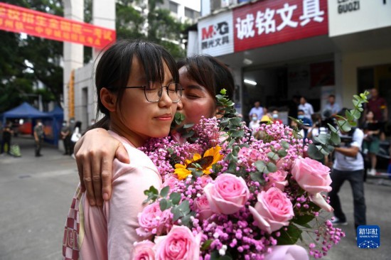 6月8日,在广西柳州铁一中学城站校区考点外,走出考场的考生与家长相拥。