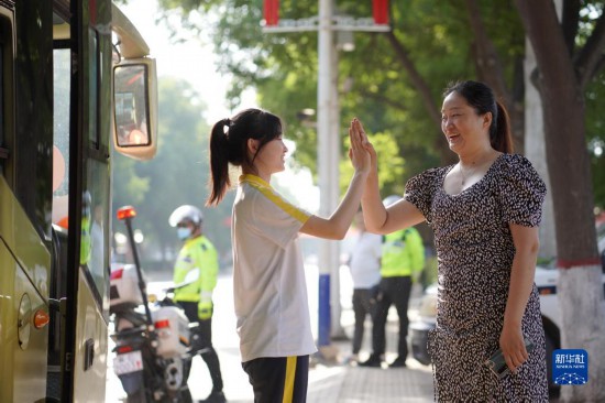 6月8日,在河北省邢台市内丘县内丘中学考点,考生与家长击掌加油。