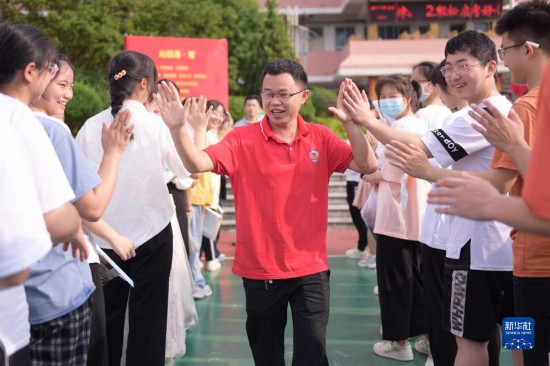 6月8日,在贵州省岑巩县第一中学考点,老师击掌为考生加油。