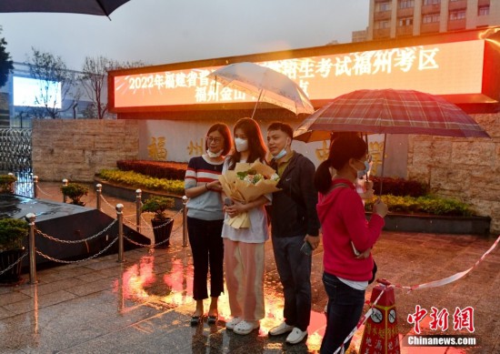 6月9日,福建福州,家长与考生在考场外合影留念。当日,福建省2022年高考结束。 中新社记者 吕明 摄