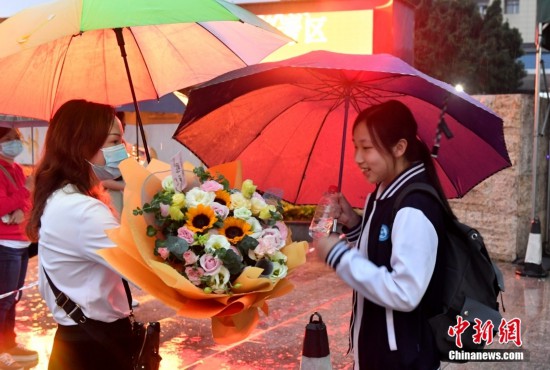 6月9日,福建福州,家长送鲜花给考生。当日,福建省2022年高考结束。 中新社记者 吕明 摄