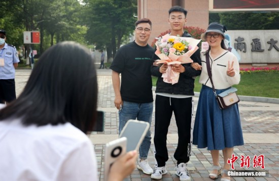 6月9日,江苏省南通市2022年普通高校招生全国统一考试南通大学附属中学考点外,考生与家长拍照留念。 中新社发 徐培钦 摄 图片来源:CNSphoto