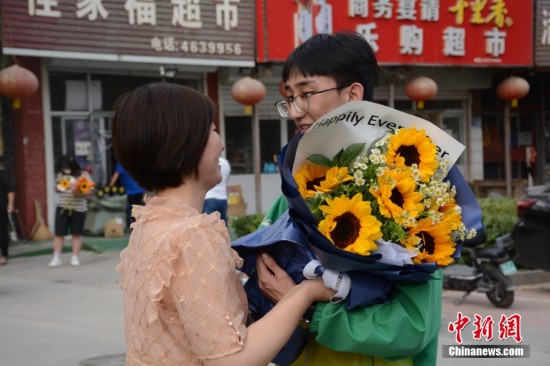 6月9日,全国部分地区高考结束。在河北省沧州市献县的献县第一中学考点,考完试的考生走出考场,收获了来自家长、兄弟姐妹、学长学姐、老师的鲜花和拥抱。图为考生接过妈妈的鲜花。彭锦帅 摄