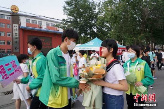 6月9日,全国部分地区高考结束。在河北省沧州市献县的献县第一中学考点,妹妹为刚走出考场的哥哥送上鲜花。 范晨龙 摄