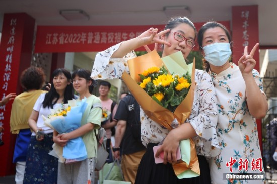6月9日,江苏南京,家长用鲜花迎接走出考场的考生。当日,江苏省2022年高考结束。 中新社记者 泱波 摄