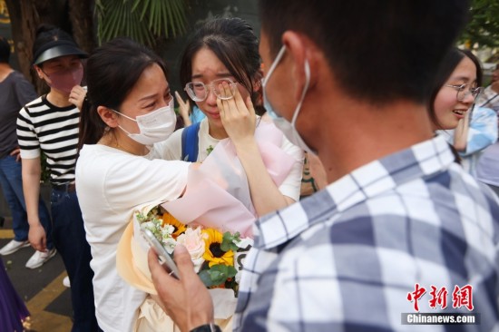 6月9日,江苏南京,一名结束高考的考生收到家长送上的鲜花,激动落泪。当日,江苏省2022年高考结束。 中新社记者 泱波 摄