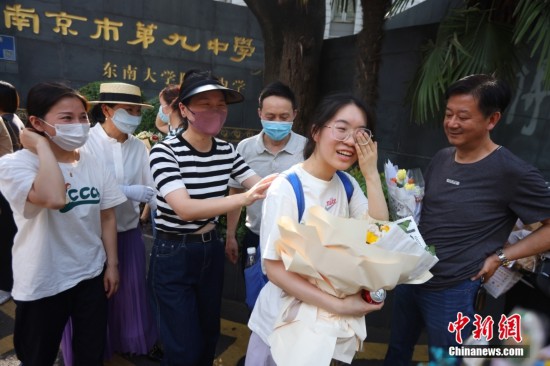 6月9日,江苏南京,一名走出高考考场的考生收到家长送上的鲜花,激动落泪。当日,江苏省2022年高考结束。 中新社记者 泱波 摄